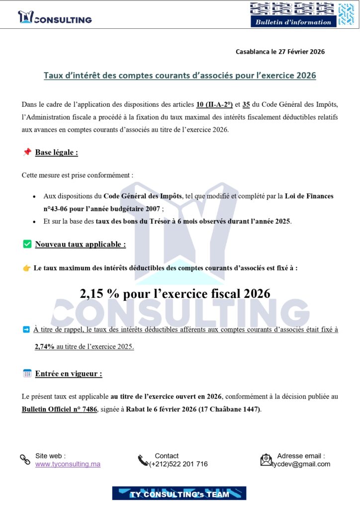 Comptes Courants d’Associés : Taux d’intérêt déductible au titre de 2026